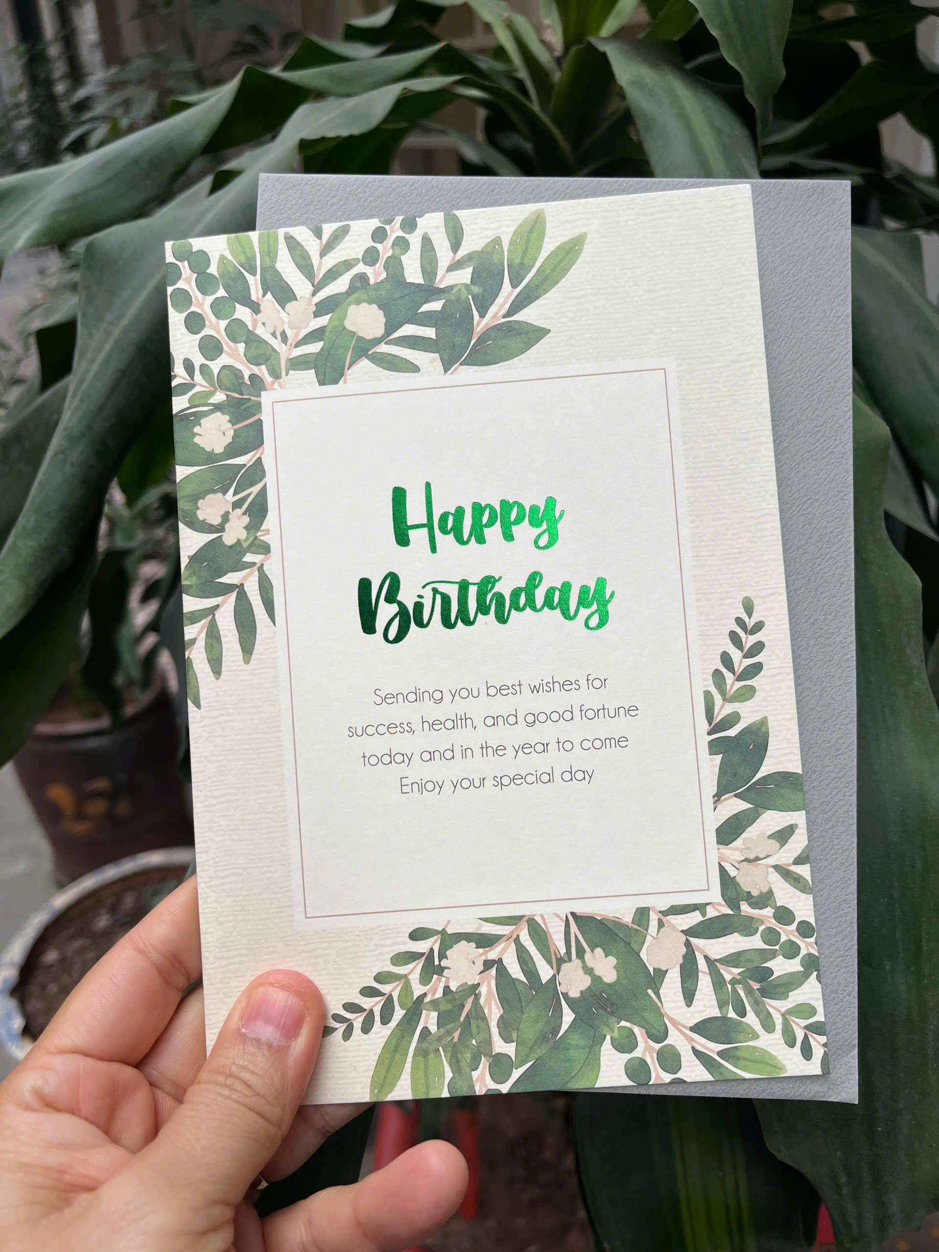 • Thiệp sinh nhật Greenwood được in trên chất liệu giấy dày dặn, chữ ép nhũ (ép kim) sang trọng