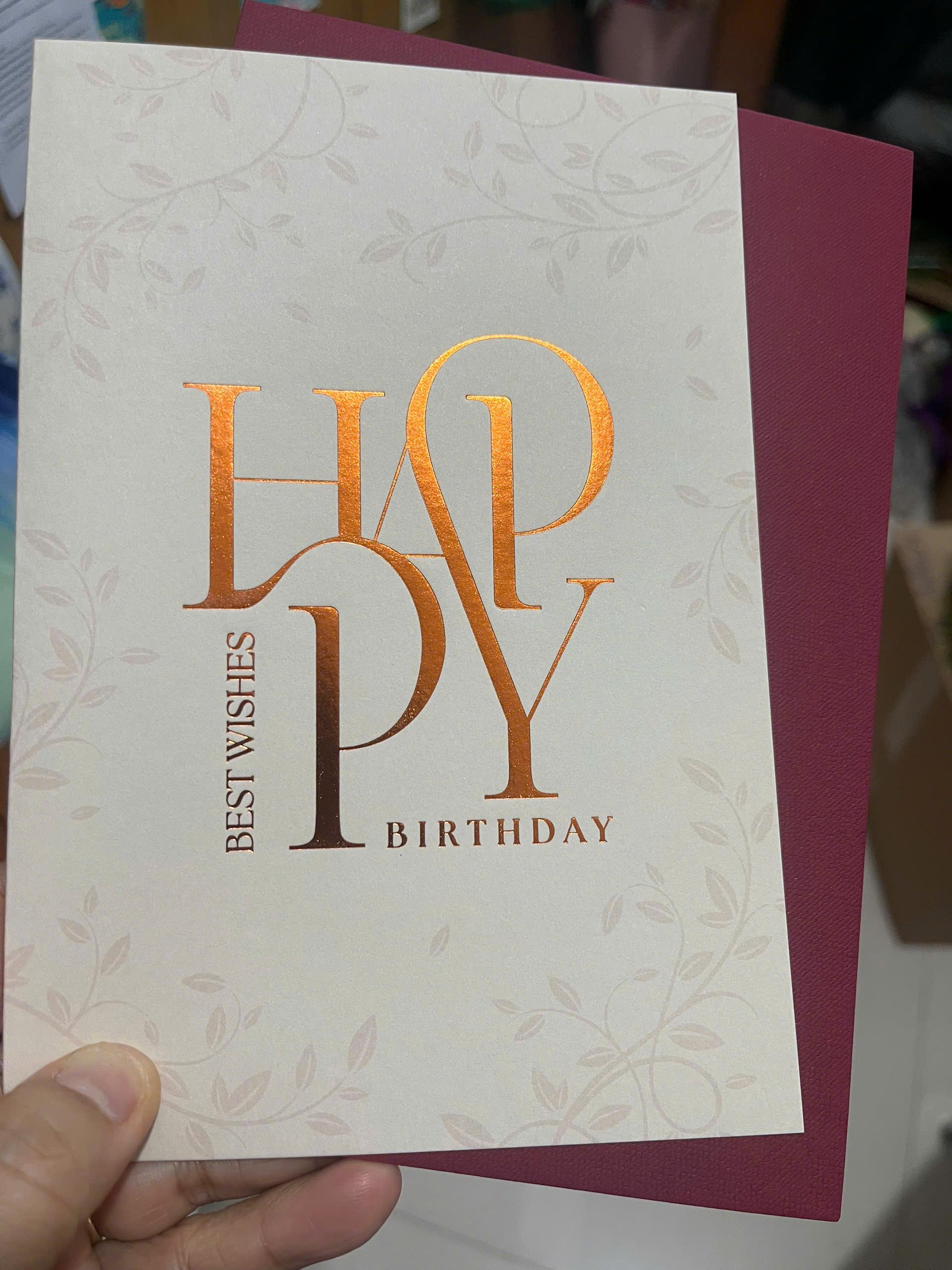 - Thiệp sinh nhật Greenwood được in trên chất liệu giấy dày dặn, chữ ép nhũ (ép kim) sang trọng