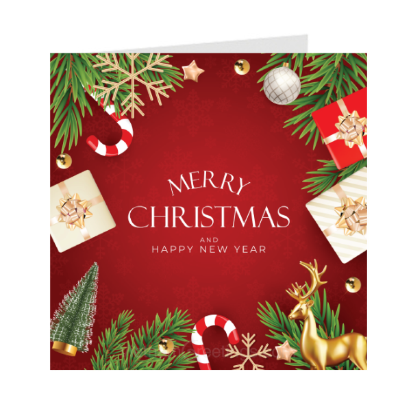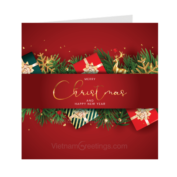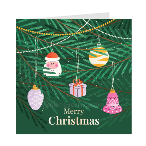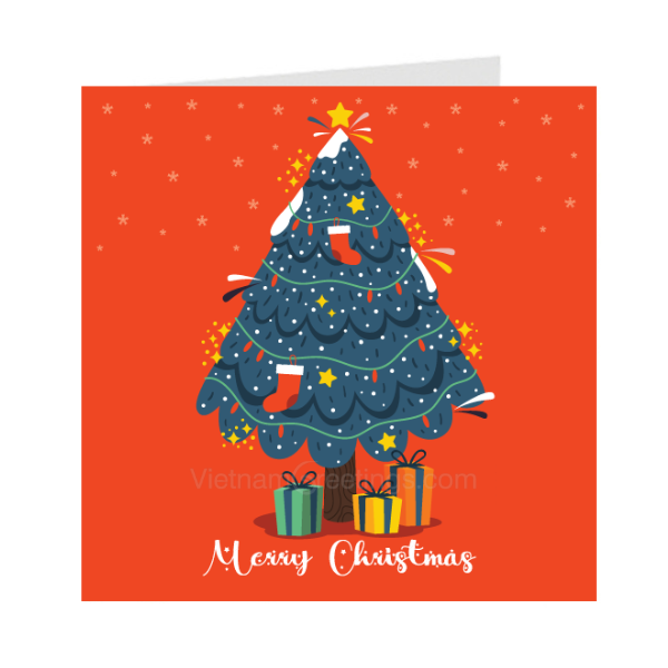 Thiệp Giáng Sinh, thiệp Noel – Thiệp Greenwood là mẫu thiệp tươi sáng, rộn ràng và giàu sắc màu lễ hội. Họa tiết cây thông, hoa tuyết, quà tặng và sắc đỏ – xanh truyền thống tạo nên tổng thể ấm áp, phù hợp với nhiều đối tượng người nhận.