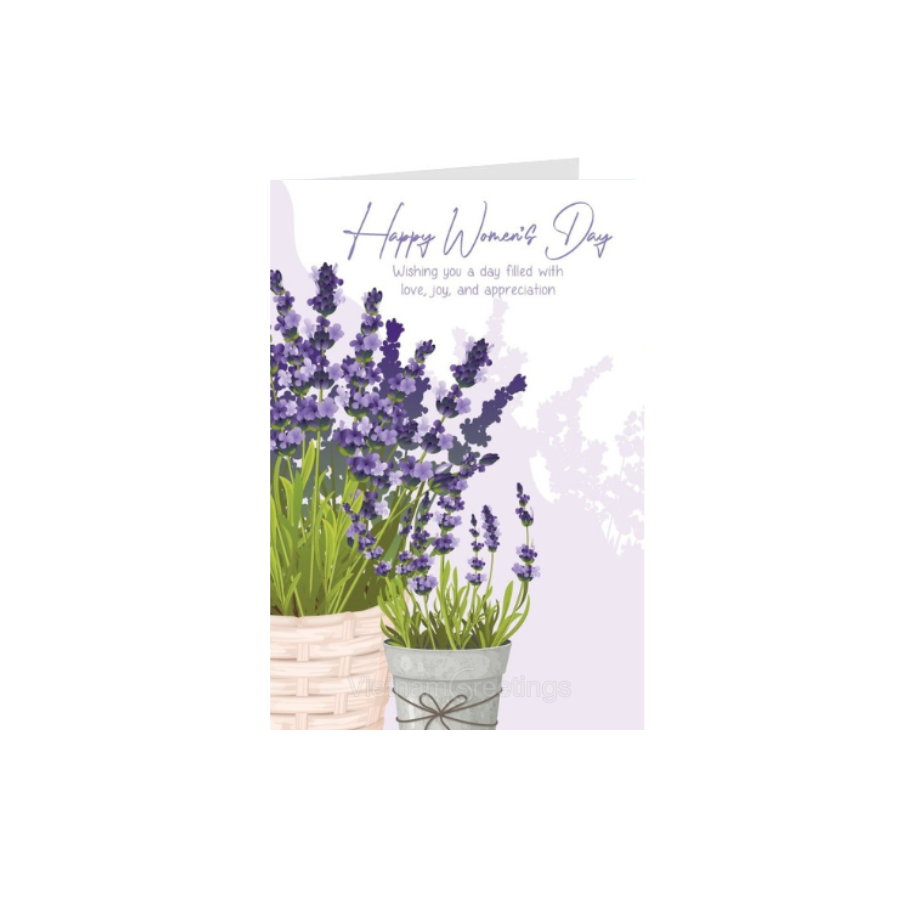 Một tấm thiệp 8/3 với hình ảnh chậu oải hương thơm dịu dàng dành tặng chị em phụ nữ