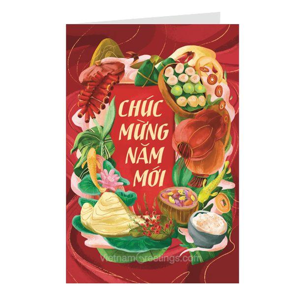 Tấm thiệp tết màu đỏ được lấy cảm hứng từ những hình ảnh quen thuộc của Tết