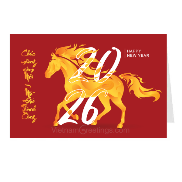 Thiệp Tết Bính Ngọ 2026 với hình ảnh chú ngựa khỏe khoắn kèm lời chúc may mắn "Mã đáo thành công"