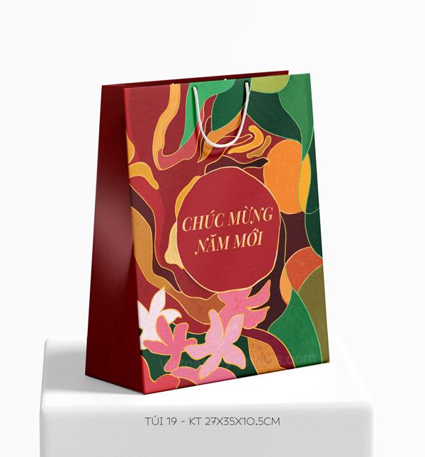 Chiếc túi đựng quà tết T19C được lấy cảm hứng từ hình ảnh bánh mứt, trà tết, bánh tét, hoa mai, câu đối đỏ